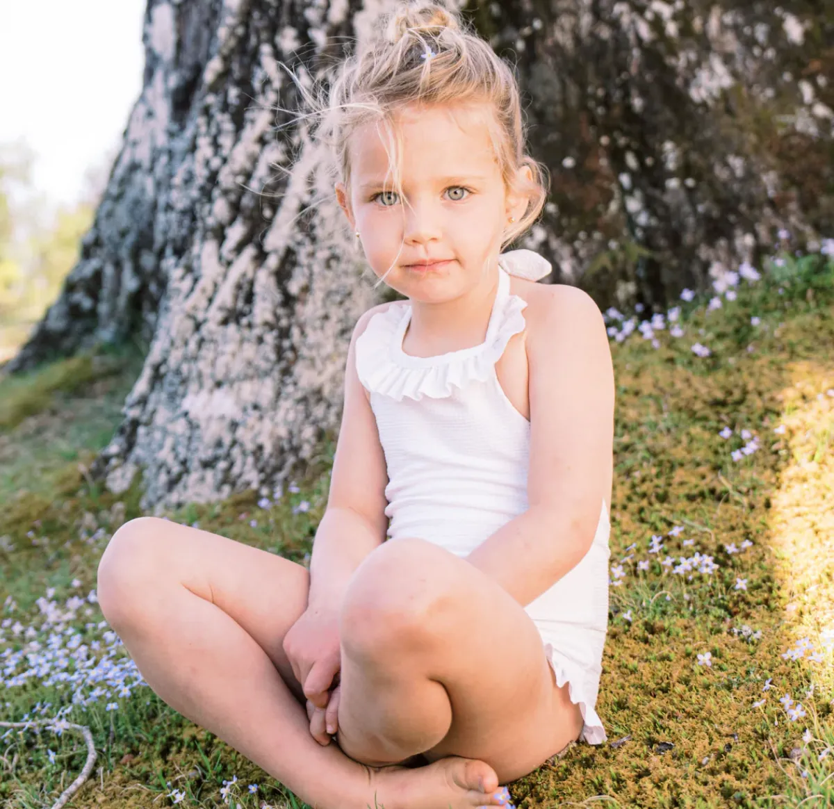 An Elevated Take On A Classic Halter One Piece. This New Silhouette For Girls Has A Chic High Neck And Our Signature Ruffle Details. It’s Fresh, But Timeless. Made With Adjustable Snaps And A Fixed Tie Knot At The Neck, It Can Grow With Your Girls. Available Here In Our Crisp Capeside White, It’s The Perfect Suit For Warm Days Ahead.