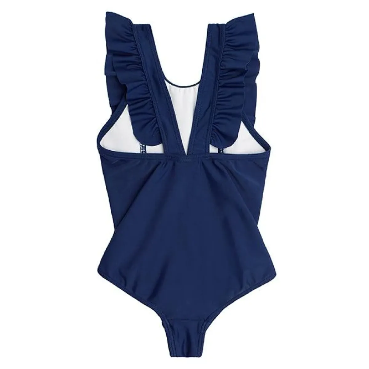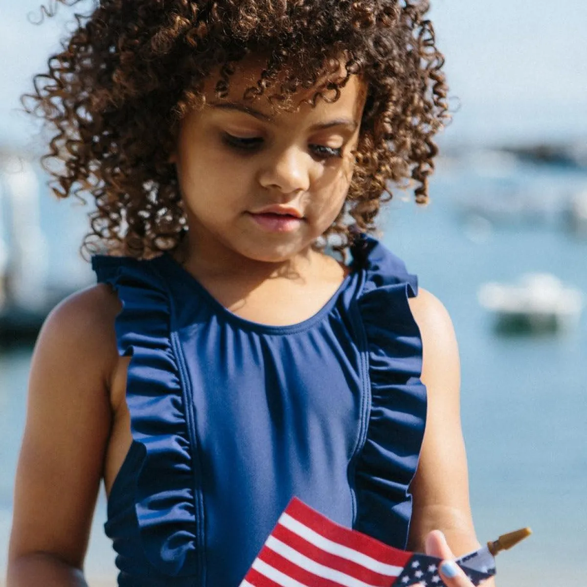 A Bestselling Style! This European Pinafore-Style One Piece Comes In Classic Navy With A Front And Back Ruffle. Fully Lined For Form And Function In And Out Of The Water. Perfect For Long Summer Days.*Ruffle Stops At Waist On Sizing 7/8 And 9/10 For A ‘Girl’ Look. Ruffle Runs All The Way Down Torso And Stops At Upper Leg On Sizes 0-6 Through 5/6T (As Pictured)
