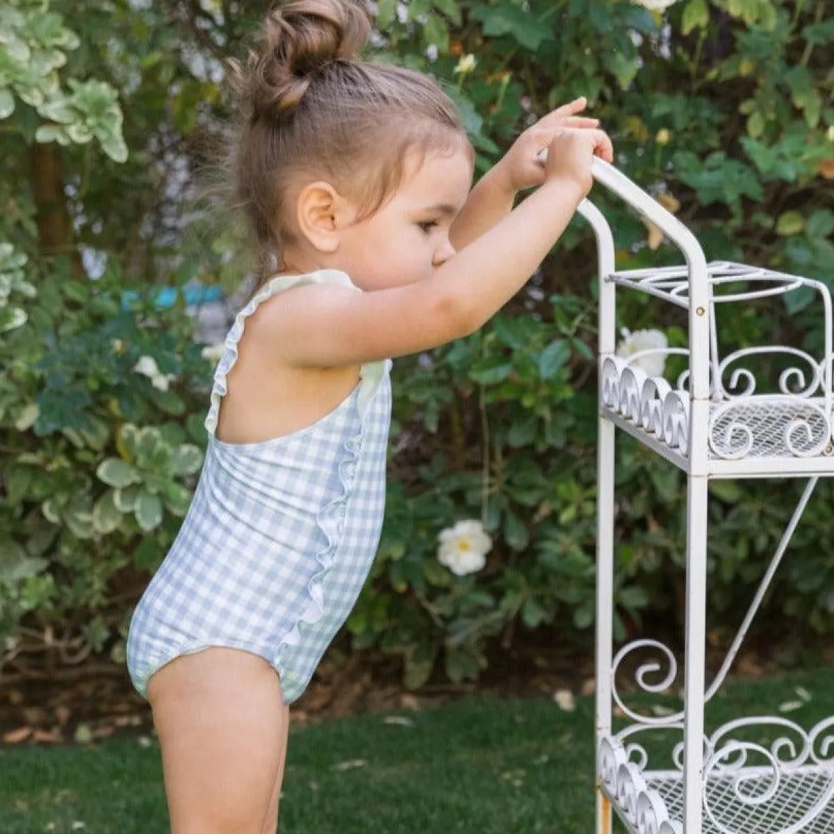 Our Iconic One Piece Style Is Back! This European Pinafore-Style Suit Is Refreshed In Our Oasis Blue Gingham With A Front And Back Ruffle. Fully Lined For Form And Function In And Out Of The Water. It’s Perfect For Long Summer Days. *Ruffle Stops At Waist On Size 5/6T To 11/12 For A ‘Girl’ Look. Ruffle Runs All The Way Down Torso And Stops At Upper Leg On Sizes 1, 2T And 3/4T (As Pictured) For ‘Toddler’ Look. Note: We Strongly Advise Against Using Aerosol Sunscreens, Which Contain Chemicals That May Stain Suits.