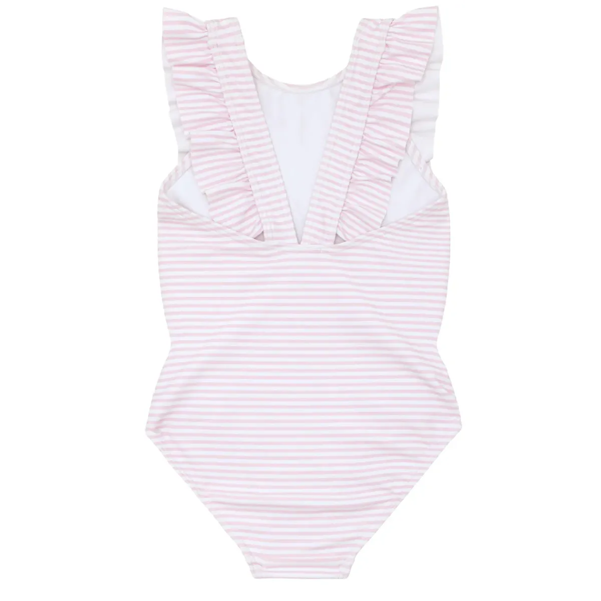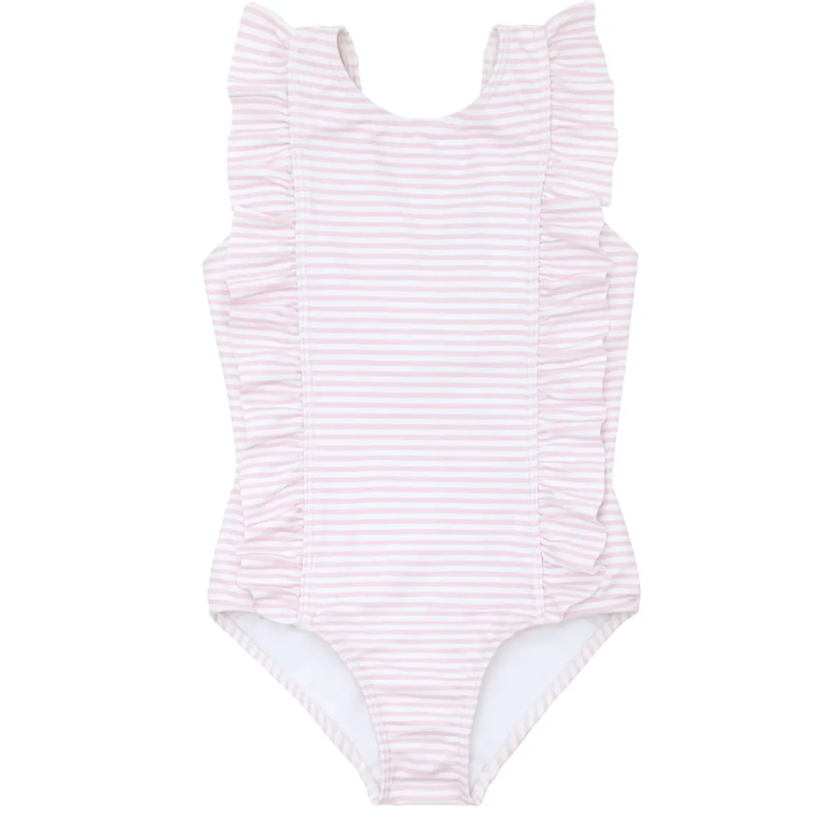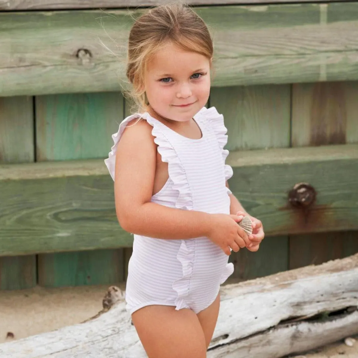 This Bestselling Pinafore-Style One Piece In Our Pink Stripe Print Is An Instant Classic, With A Playful Front And Back Ruffle That Give It A Feminine Touch. Fully Lined For Form And Function In And Out Of The Water And Perfect For Long Days In The Sun! *Ruffle Stops At Waist On Sizing 7/8 And 9/10 For A ‘Girl’ Look. Ruffle Runs All The Way Down Torso And Stops At Upper Leg On Sizes 0-6M Through 5/6. Note: We Strongly Advise Against Using Aerosol Sunscreens, Which Contain Chemicals That May Stain Suits.
