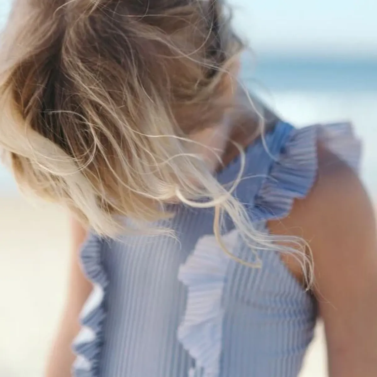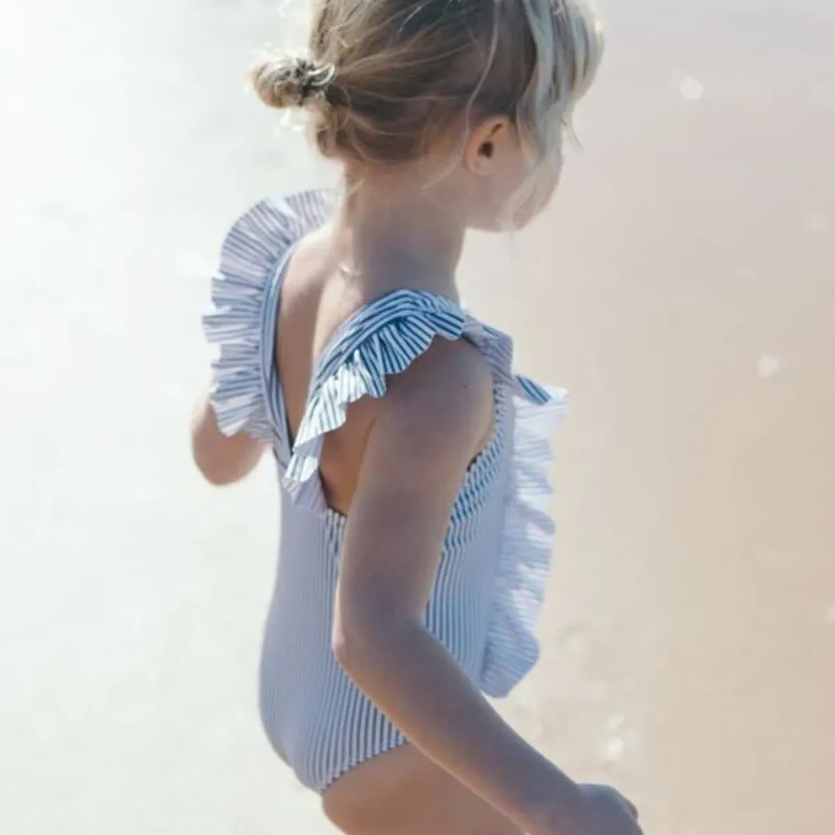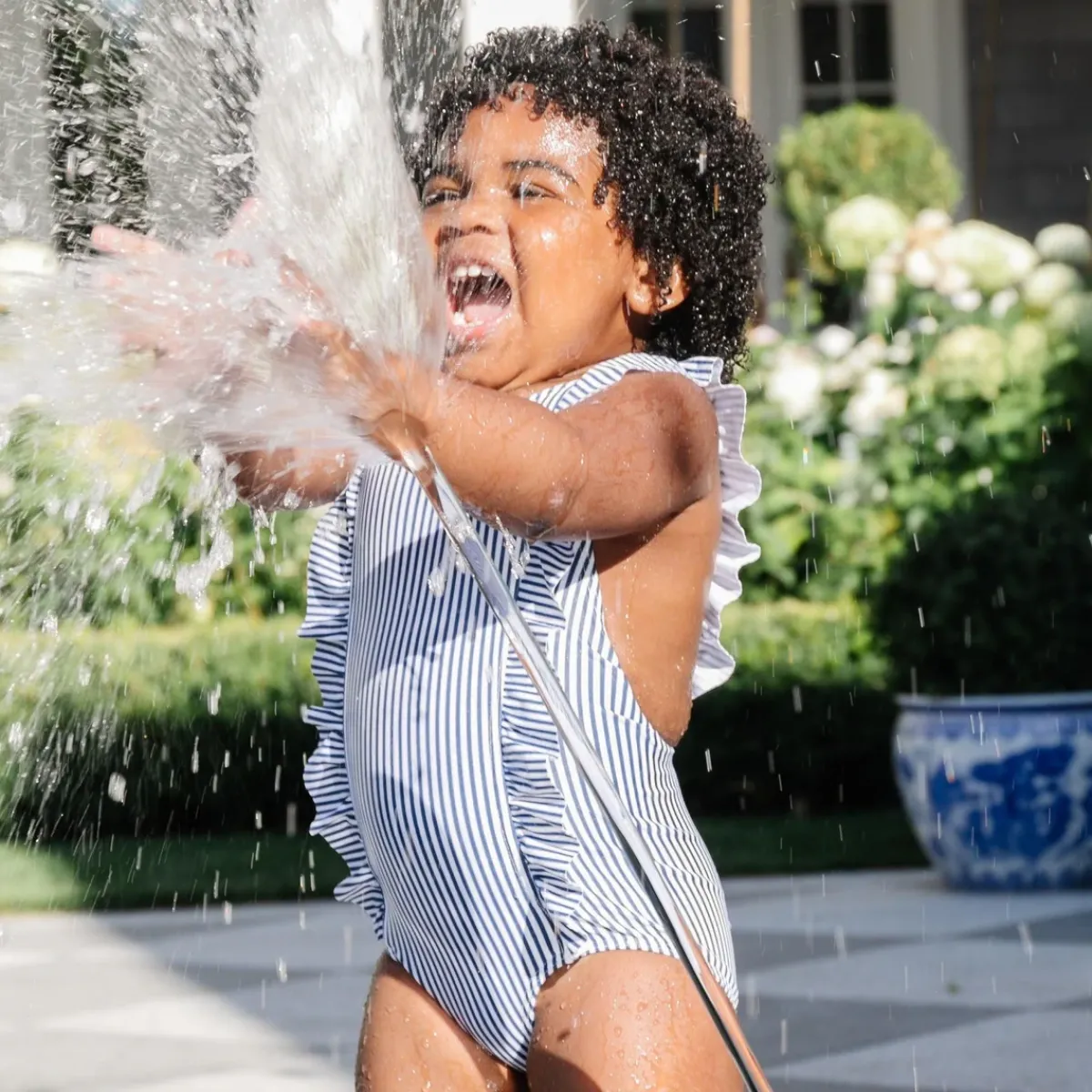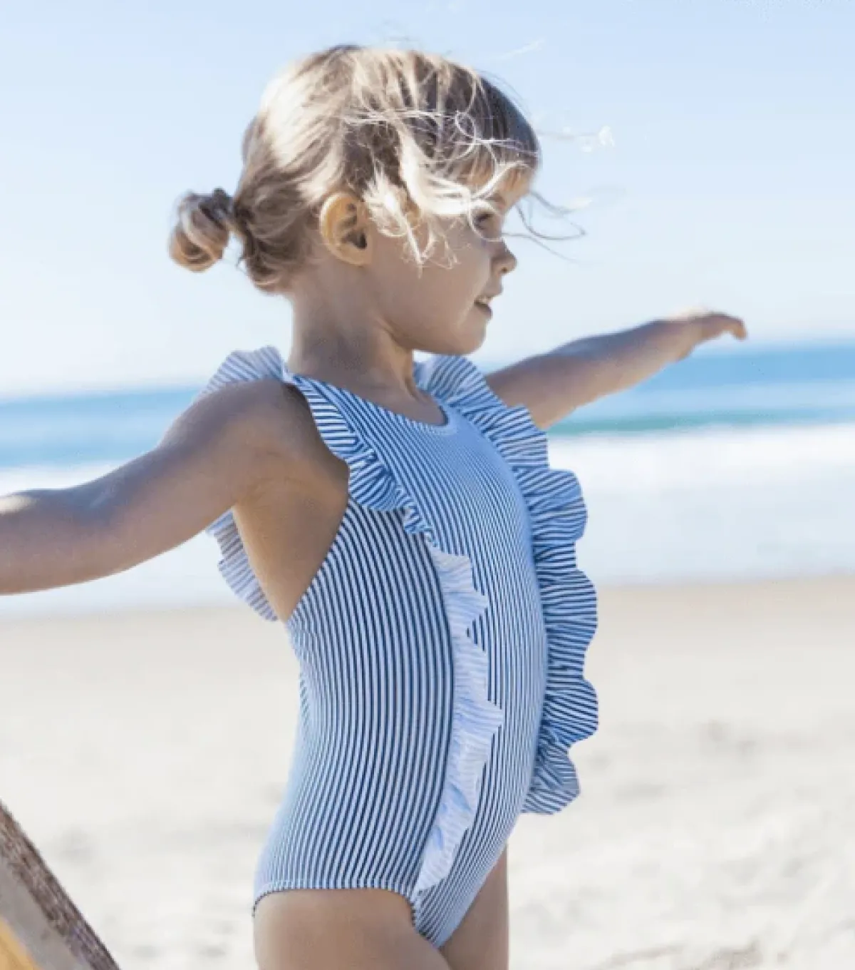 Our Iconic Minnow One Piece! This European Pinafore-Style One Piece Comes In A Custom Navy Stripe Print With A Front And Back Ruffle. Fully Lined For Form And Function In And Out Of The Water. Perfect For Long Summer Days.*Ruffle Stops At Waist On Sizing 7/8 And 9/10 For A ‘Girl’ Look. Ruffle Runs All The Way Down Torso And Stops At Upper Leg On Sizes 1, 2T, 3/4T And 5/6 (As Pictured).