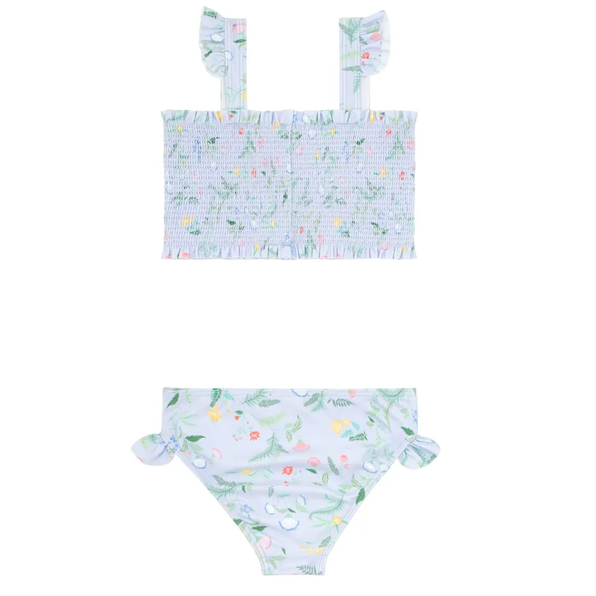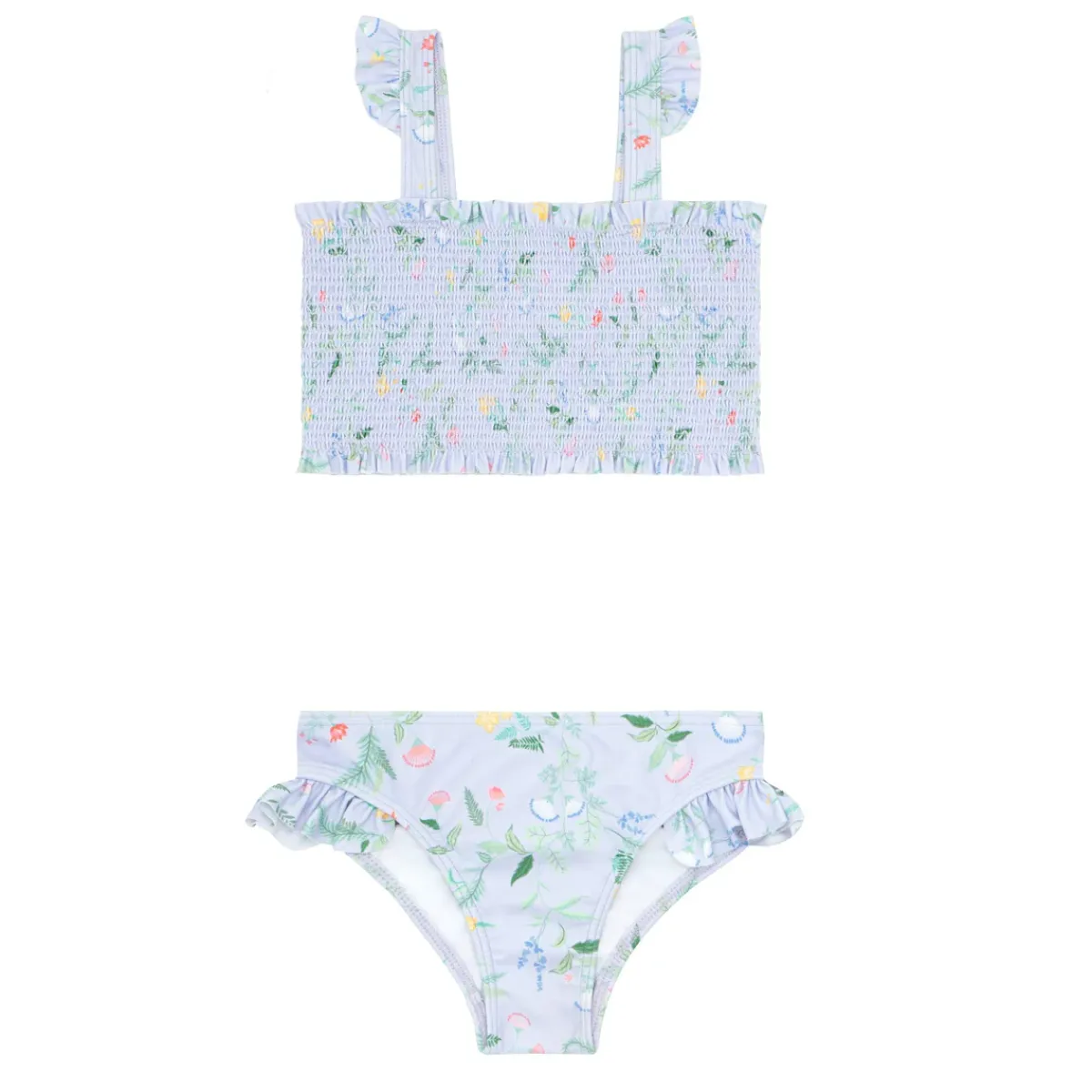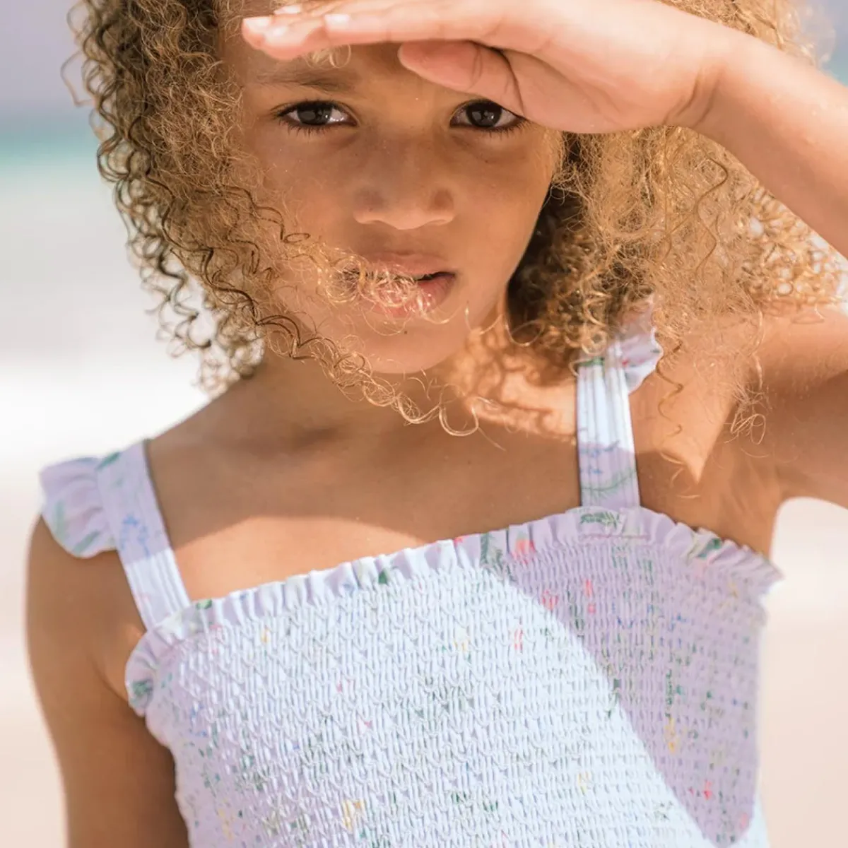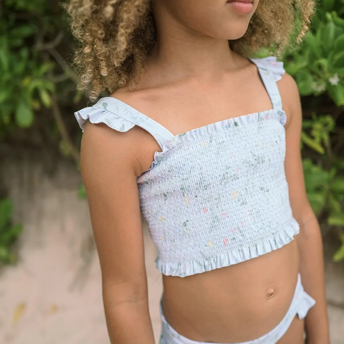 This Girls Bikini In Our Bay Lavender Floral Has Sweet Smocking On The Top And A Delicate Ruffle Details On The Straps And Matching Bottoms. This Suit Is Ready For Memories In The Sun!