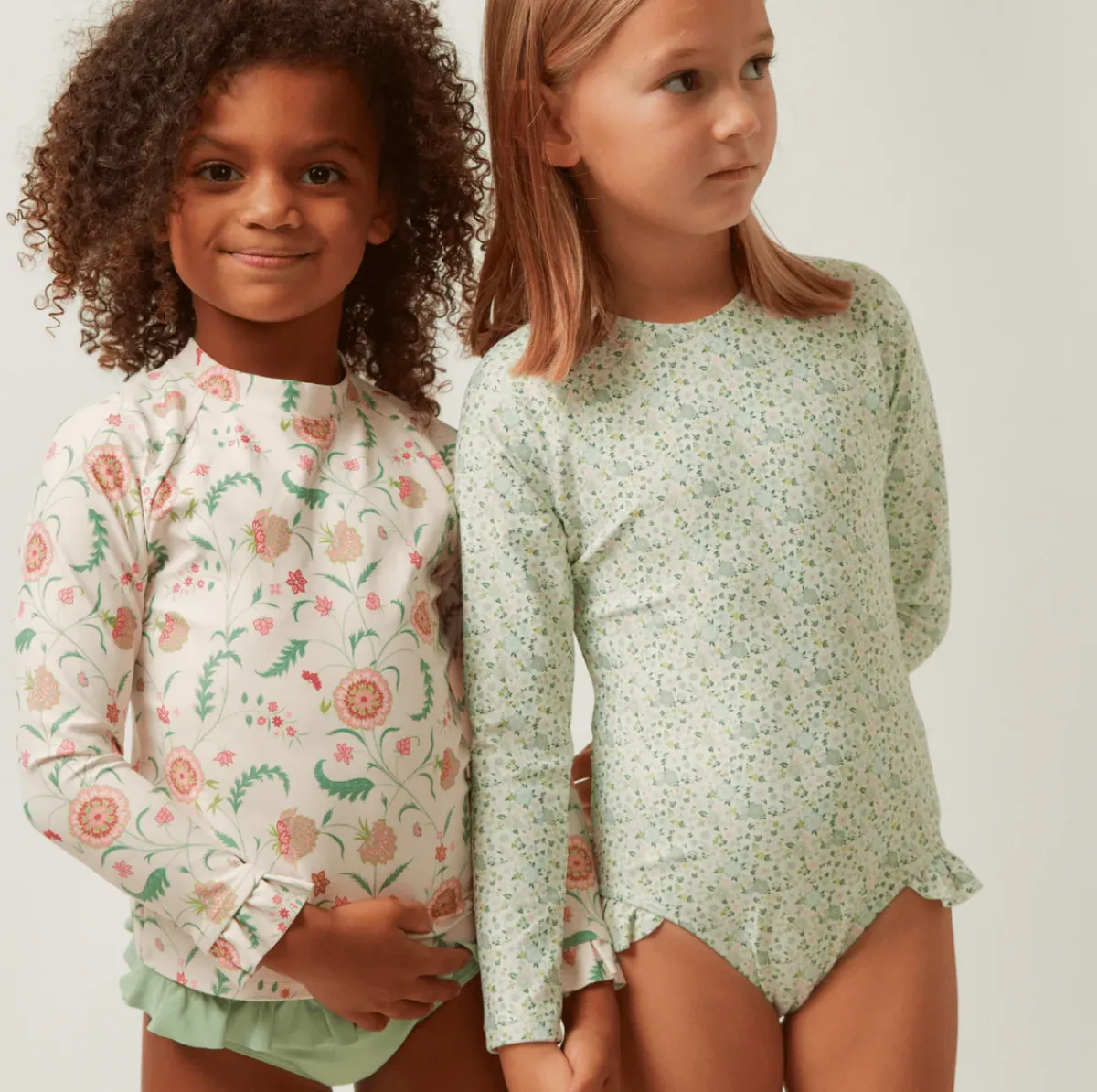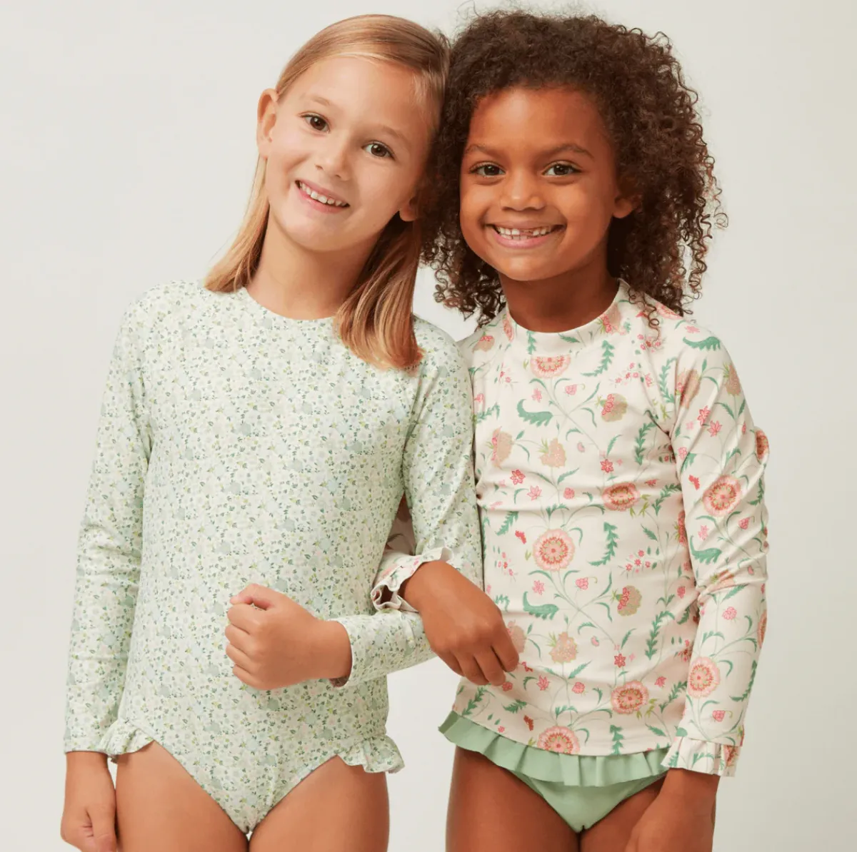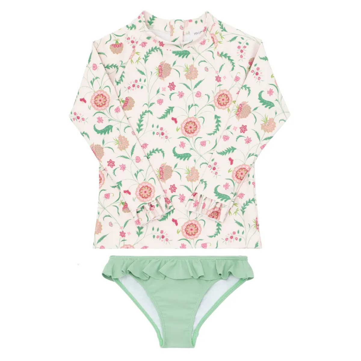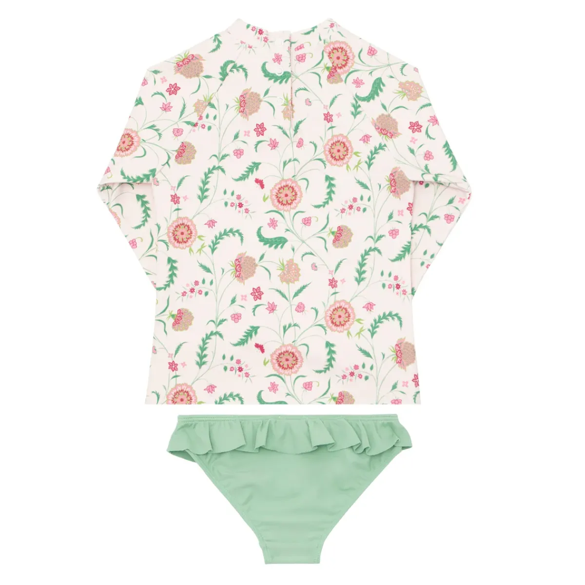 Our Classic Rashguard Is Available Here As A Perfect Pair With Our Signature Bikini Bottoms. Pairing Our Cloister Botanical Print And Solid Sea Marsh Green Bottoms This Set Is Updated With A Soft Ruffle At The Wrist And On The Bikini Bottoms. It Is A Cute And Comfortable Sun Coverage Option Designed For All Day Play. Note: We Strongly Advise Against Using Aerosol Sunscreens, Which Contain Chemicals That May Stain Suits.