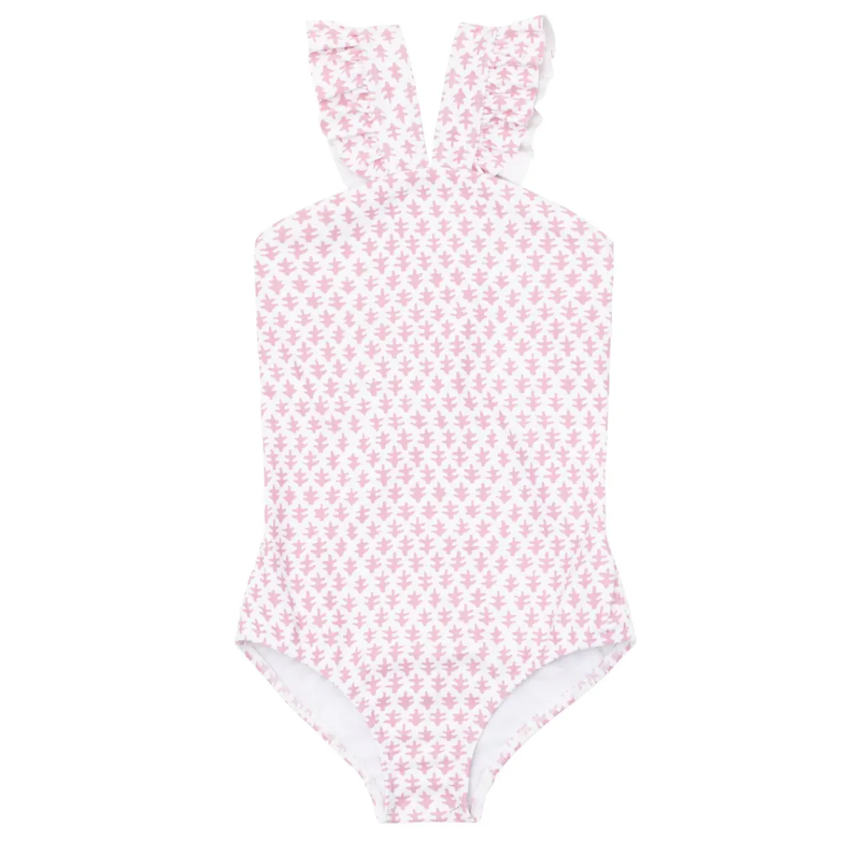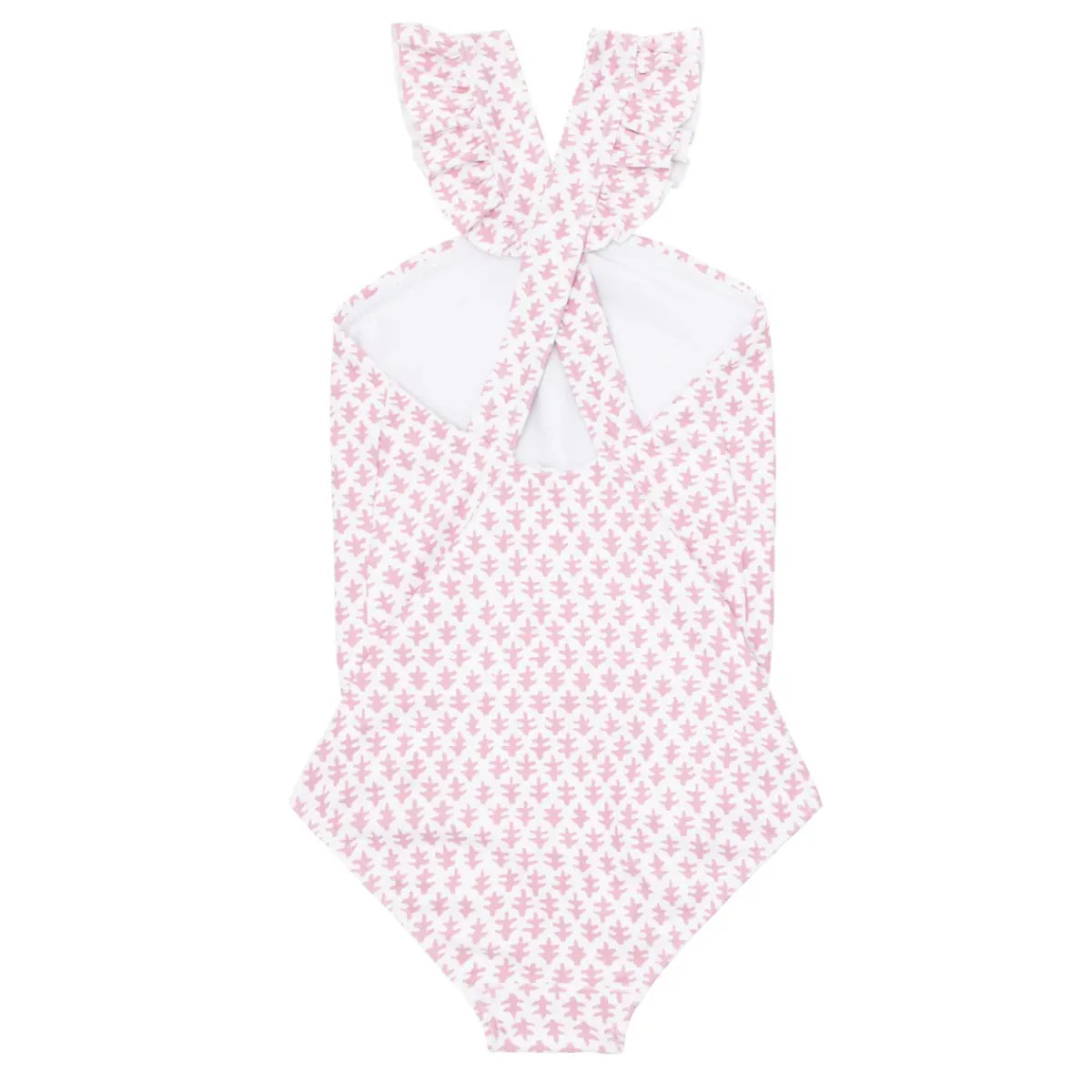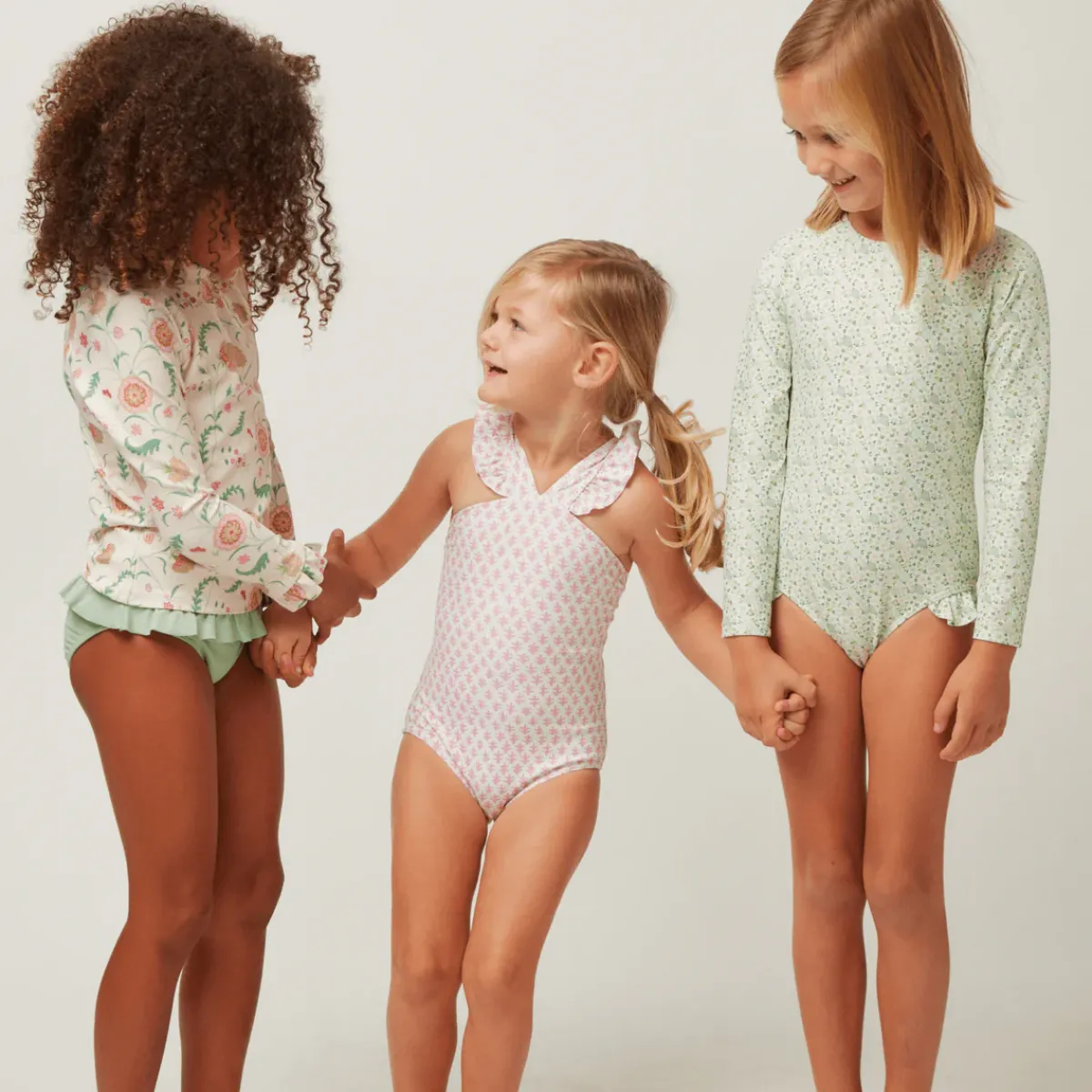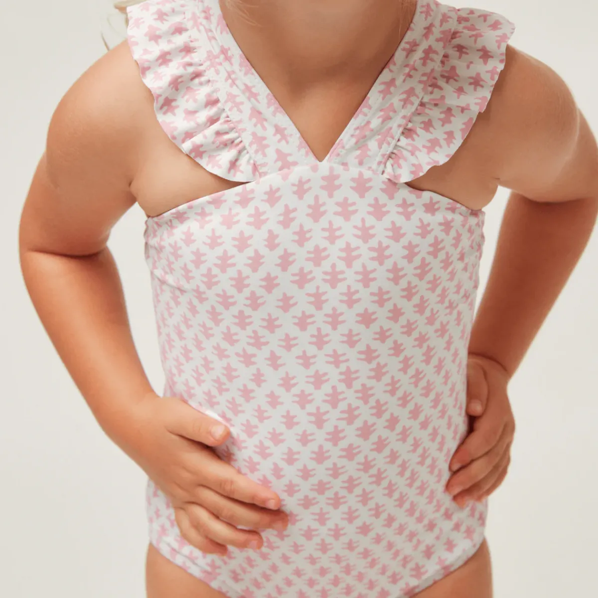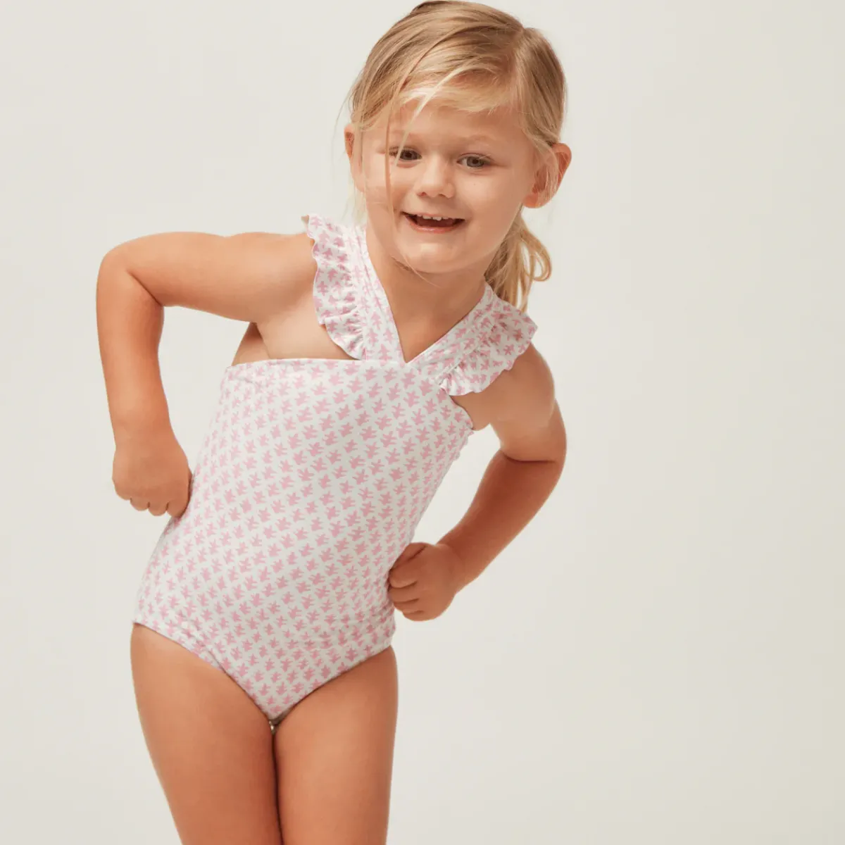 Our Newest Silhouette For Girls! Featuring A Unique V-Neck With Our Signature Ruffle Detail And A Cute Criss-Crossed Back, This Easy Shape Is Sure To Be A New Favorite. In Our Beautiful Nectar Leaf Print From Sister Parish, It Is The Perfect Choice For Your Next Getaway. Note: We Strongly Advise Against Using Aerosol Sunscreens, Which Contain Chemicals That May Stain Suits.