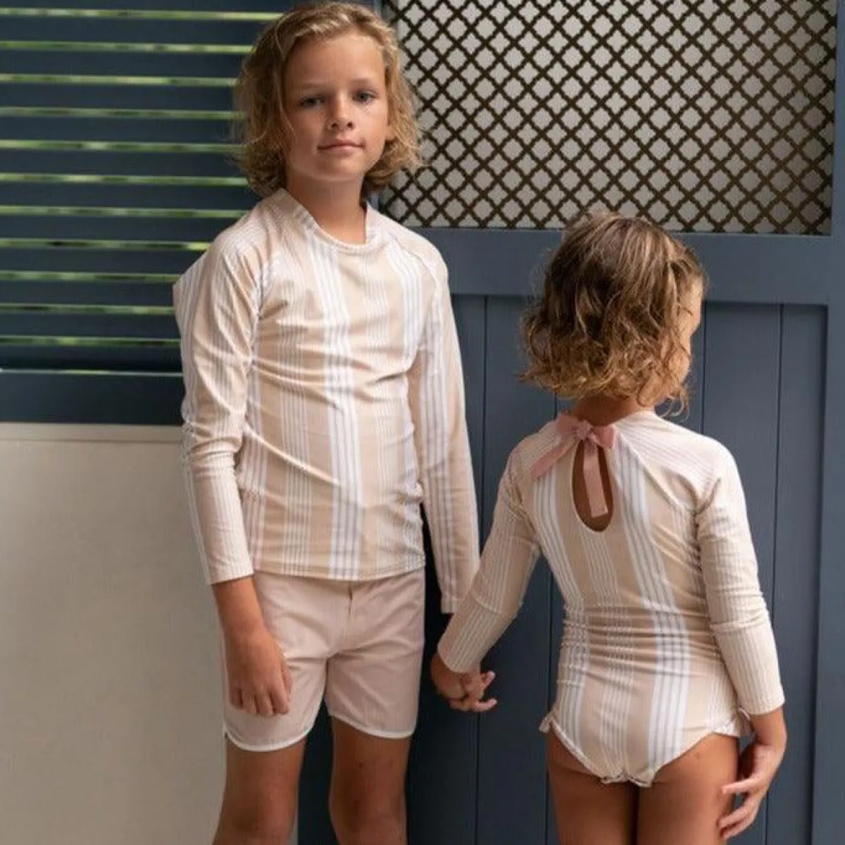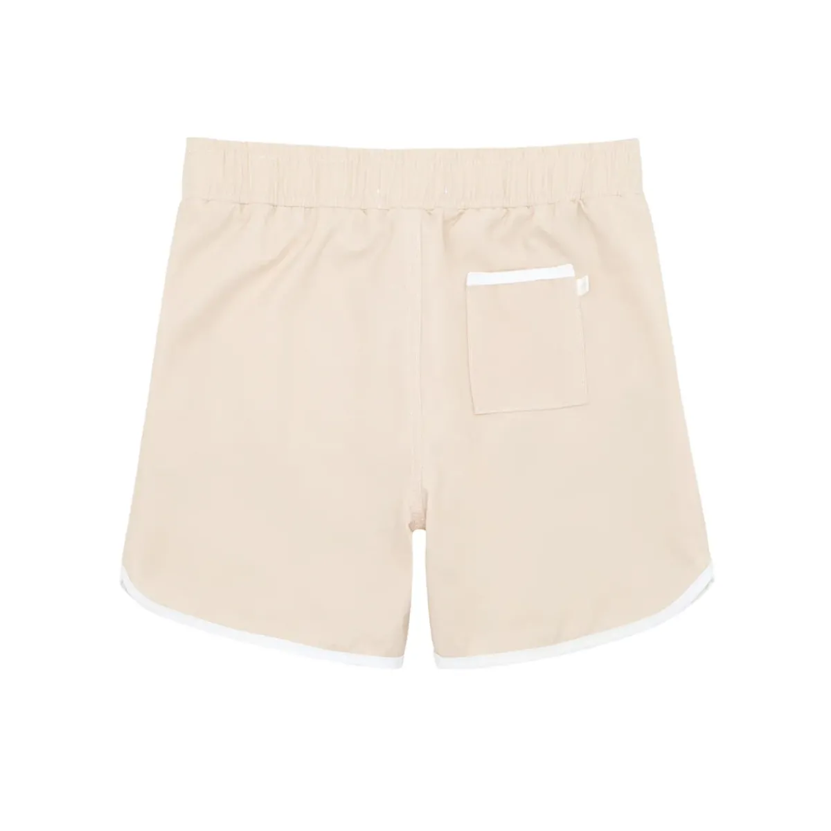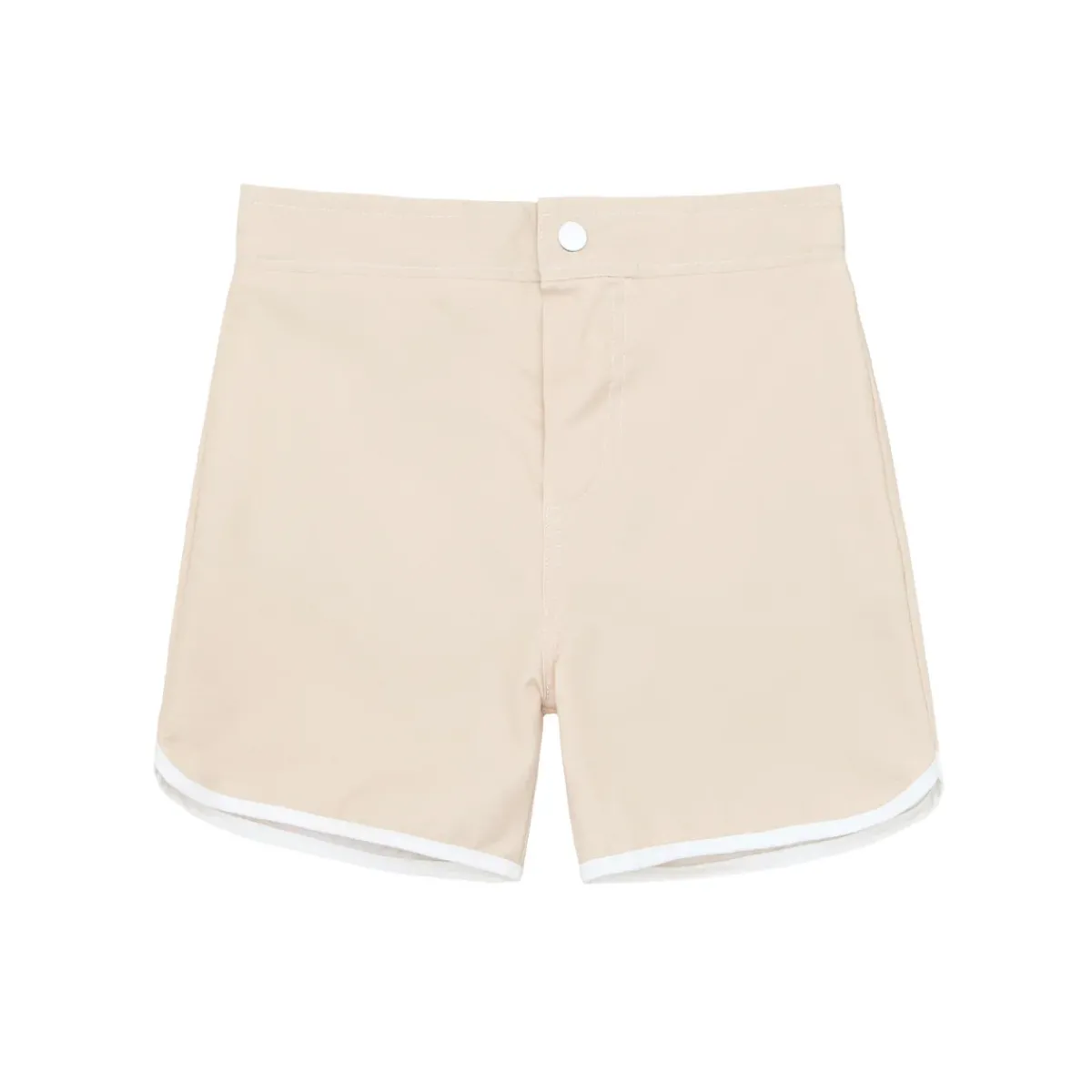 A Resort Update To Our New Sun Short! With A Flat Front Waist And Enamel Snap Closure, This Traditional Boardshort Style In Tan With White Binding Features An Elastic Back With Adjustable Buttons On The Inside Waistband To Ensure The Proper Fit. Suited Perfectly For The Older Boy, Sizing Begins At Size 5/6. An Embroidered Minnow Wave Logo On The Front Leg Completes This Style That Flows Perfectly From The Water To Any Fun-Filled Day In The Sunshine! Note: We Strongly Advise Against Using Aerosol Sunscreens, Which Contain Chemicals That May Stain Suits.